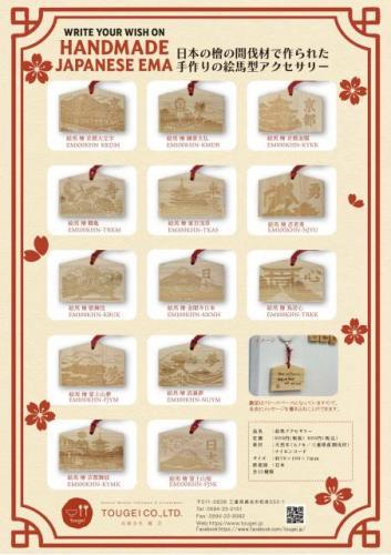 日本の観光名所や縁起物のイラストが描かれた絵馬型のアクセサリーです。