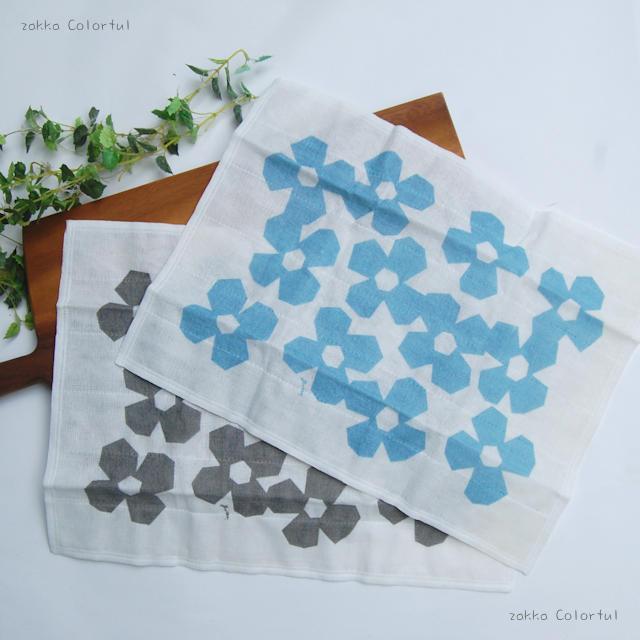 「大判かや生地ふきん フラワー ブルー」はまるで切り絵のようにアイコニックなお花柄。