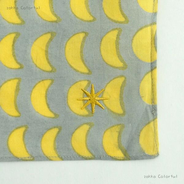 月の満ち欠けとともに、きらめく星を刺繍で表現したブロックプリントハンカチ。