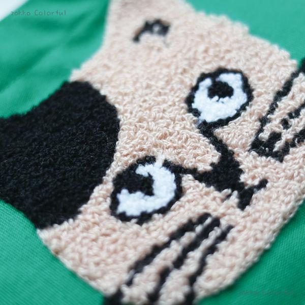 表には、ふわっと立体感のあるモコモコ刺繍でネコの顔を。