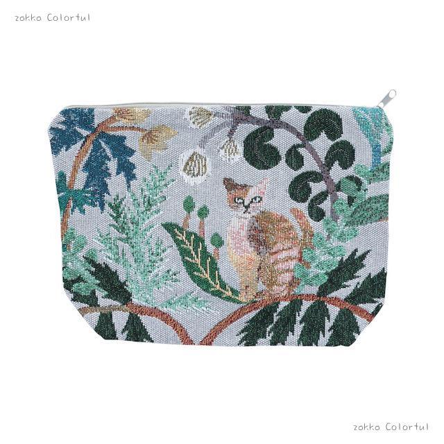 松尾ミユキさんによる、動物と植物の切り絵モチーフが広がる、ゴブラン素材のポーチです。