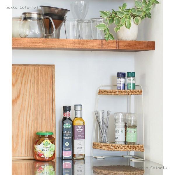 上段と下段でサイズを変えた2段設計のため、上段には調味料や小物、下段にはボトル類やキッチンツールなど、用途に合わせて自然と使い分けられるのが特徴です。