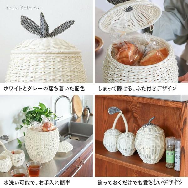 丸みのあるフォルムが印象的な、フルーツモチーフのフタ付き収納バスケットです。