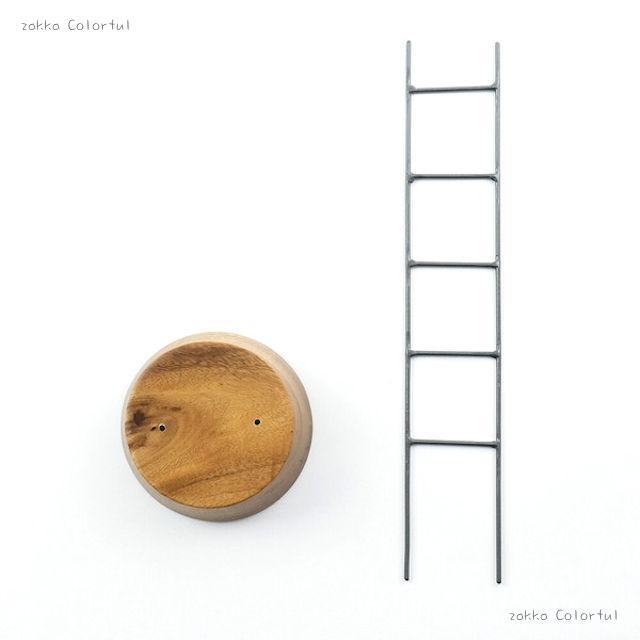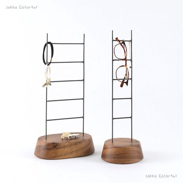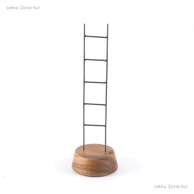 小さなアイアンラダー(はしご)とアカシアプレートを組み合わせたアクセサリースタンド。