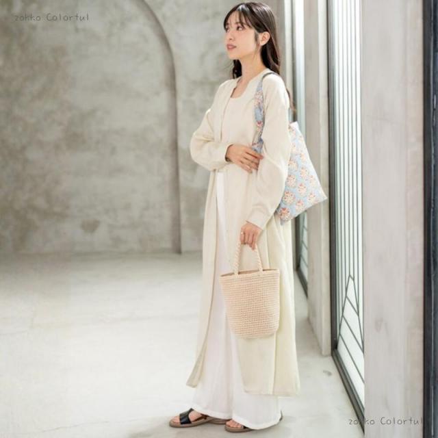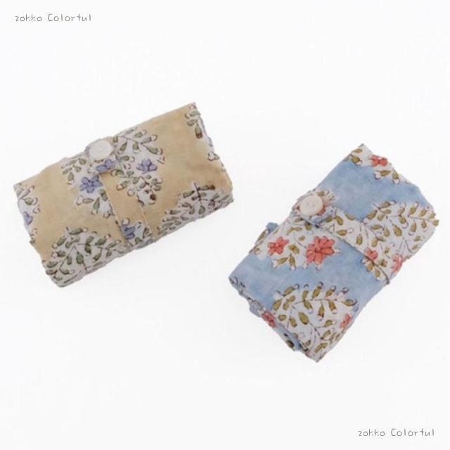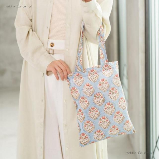 優しい色合いと素朴な小花柄がインドらしいブロックプリントのバッグは、シンプルな装いのアクセントに。